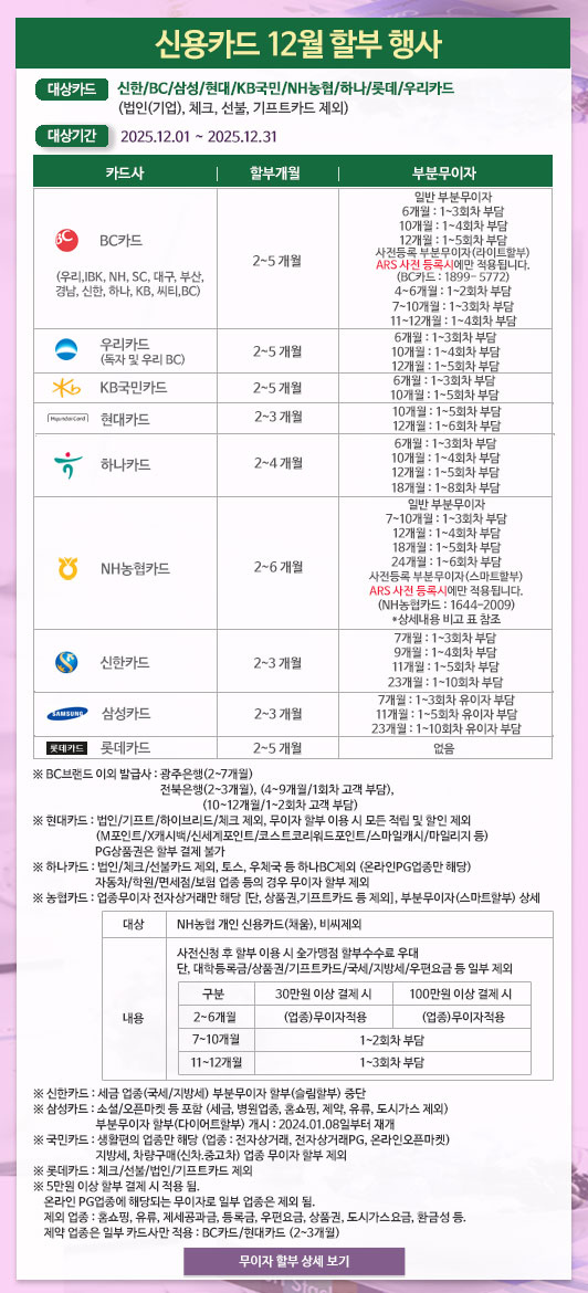 공지사항 마이투어픽 공지사항 예약내역 쿠폰 위시리스트 1:1문의 상품QnA 고객센터 공지사항 신용카드 2025년 12월 무이자 할부 행사 안내 (KSNET) View 17 투어픽 2025. 12. 1. 14:53 <무이자 할부 상세 보기 > 이전 목록 다음