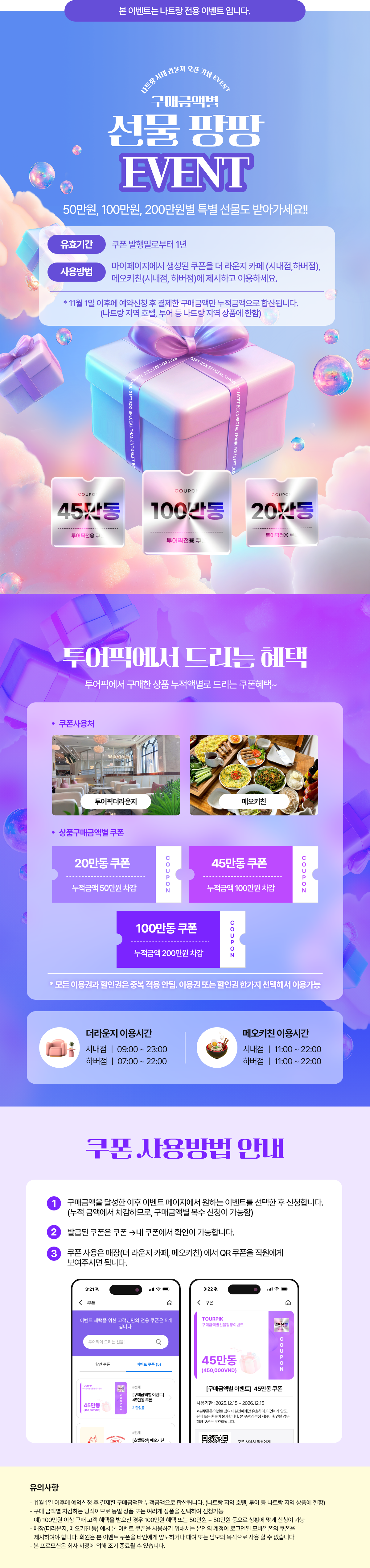 구매금액별 선물팡팡 이벤트 (나트랑 지역) 작성자 : 투어픽 작성일 : 2025. 10. 28. 10:26 조회 : 120 이벤트 신청 가능금액 0원 구매금액(누적) 0원 혜택 구매금액 사은품 신청 50만원 우리가 (Nhà Hàng WOORIGA) 10% 할인 불가 100만원 오뚜기식당 푸꾸옥 (Ottogi) 10% 할인 불가 200만원 젠틀맨 케어 나트랑 2호점 15% 할인 불가 ※ 누적 구매금액에서 신청금액이 차감됩니다. 이전 목록 다음 댓글 0 더보기