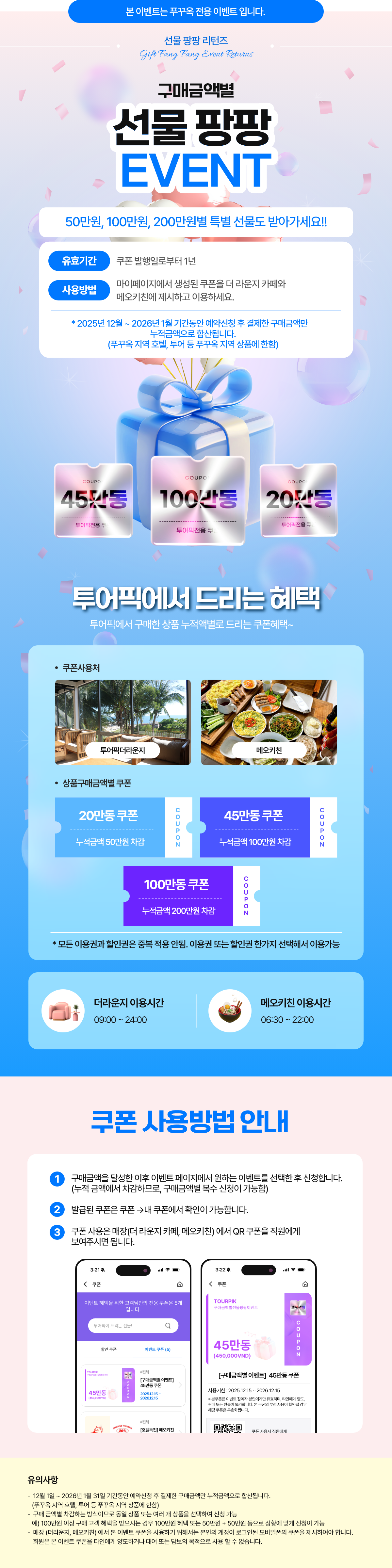 [푸꾸옥]구매금액별 선물팡팡 리턴즈~! 작성자 : 관리자 작성일 : 2025. 11. 27. 15:10 조회 : 190 이벤트 신청 가능금액 0원 구매금액(누적) 0원 혜택 구매금액 사은품 신청 50만원 [푸꾸옥] 구매금액 이벤트 20만동 이용권 불가 100만원 [푸꾸옥] 구매금액 이벤트 45만동 이용권 불가 200만원 [푸꾸옥] 구매금액 이벤트 100만동 이용권 불가 ※ 누적 구매금액에서 신청금액이 차감됩니다. 이전 목록 댓글 0 더보기