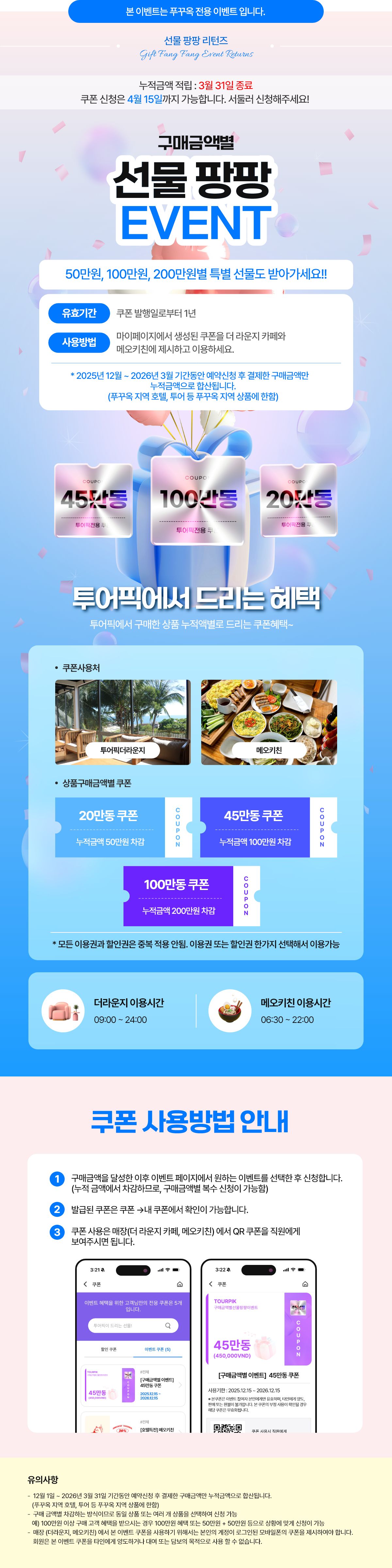 [푸꾸옥]구매금액별 선물팡팡 리턴즈 (3월말종료, 신청만 가능) 작성자 : 관리자 작성일 : 2025. 11. 27. 15:10 조회 : 9,157 이벤트 신청 가능금액 0원 구매금액(누적) 0원 혜택 구매금액 사은품 신청 50만원 [푸꾸옥] 구매금액 이벤트 20만동 이용권 불가 100만원 [푸꾸옥] 구매금액 이벤트 45만동 이용권 불가 200만원 [푸꾸옥] 구매금액 이벤트 100만동 이용권 불가 ※ 누적 구매금액에서 신청금액이 차감됩니다. 이전 목록 댓글 0 더보기