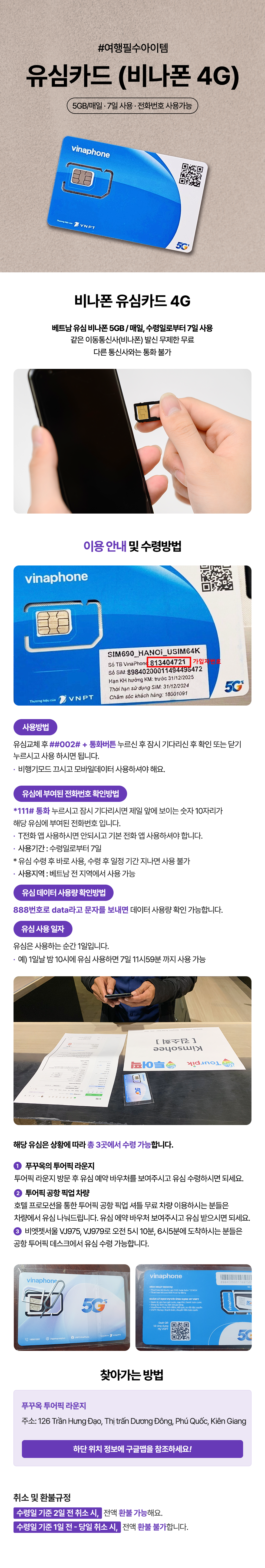 [푸꾸옥] 유심카드(비나폰 4G)특가 행사중, 5GB/매일, 7일 사용, 전화번호 사용가능