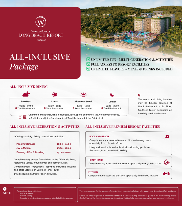 올인클루시브 : 조식 + 주식 + 석식 + 간식 + 드링크(무알콜 및 알콜 포함) + 호텔에서 제공하는 엔터테인먼트 활동 * 룸서비스 & 미니바 불포함 *