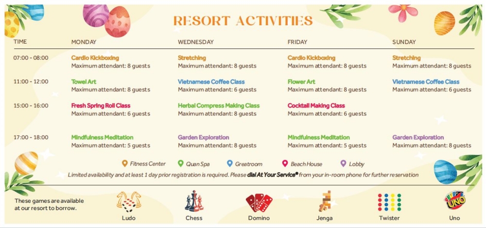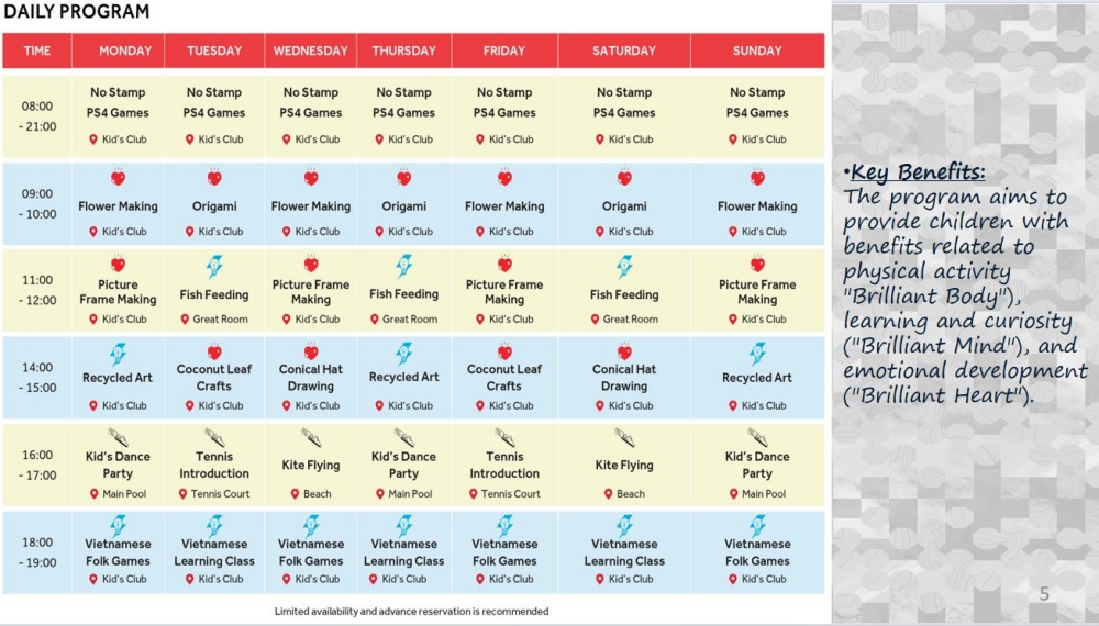 또한 다양한 레스토랑에서 베트남 및 인터내셔널 요리를 경험할 수 있으며, 키즈클럽과 액티비티 프로그램, 스파, 테니스 코트 등 부대시설도 잘 갖춰져 있습니다.