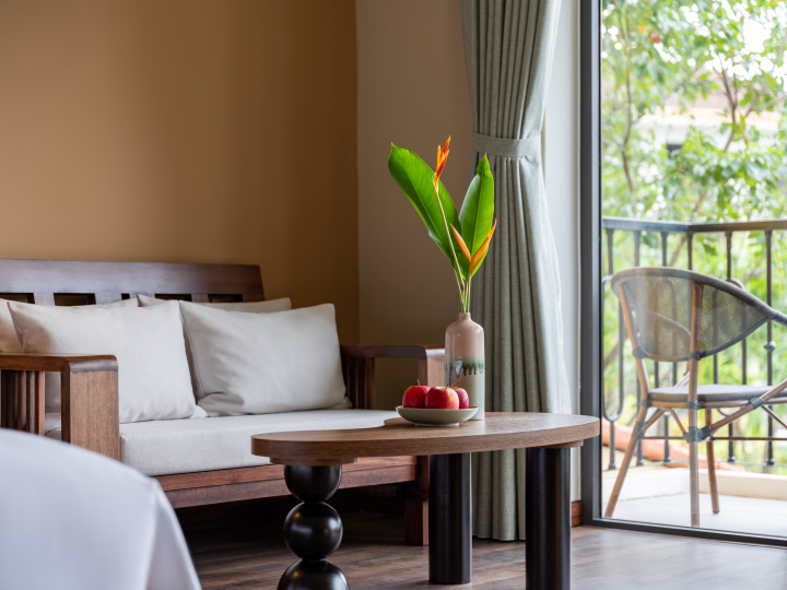객실은 따뜻한 우드톤과 베트남 전통 요소를 살린 인테리어로 꾸며져 아늑하면서도 세련된 분위기를 제공하며