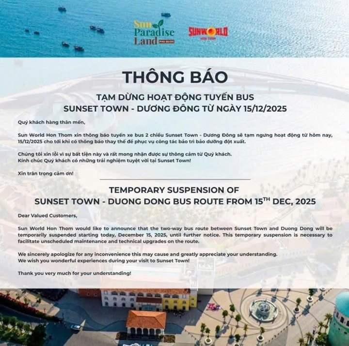 📢 2025년12월15일부로 즈엉동 지역<->선셋타운 무료 선버스의 운행이 잠정적으로 중단되며, 운영 재개 날짜는 미정입니다.