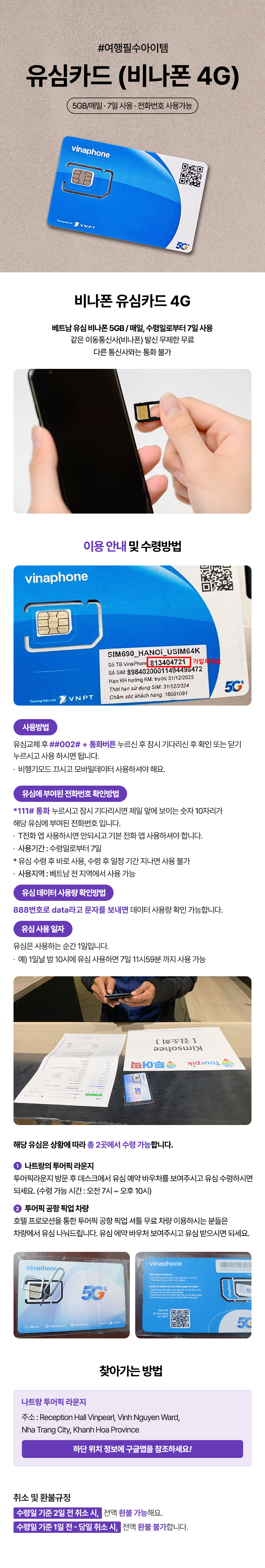 [나트랑] 유심카드(비나폰 4G), 5GB/매일, 7일 사용, 전화번호 사용가능